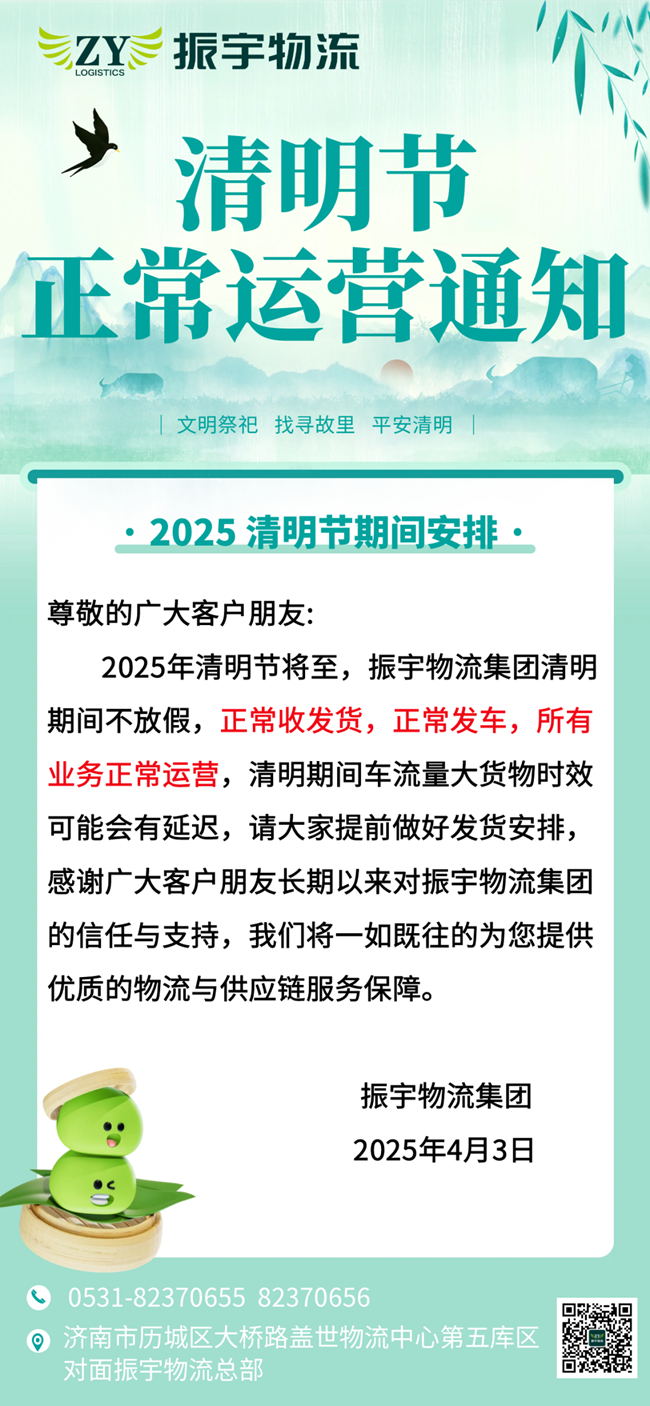 2025年清明節將至,振宇物流集團清明期間不放假,正常收發貨,正常發車,所有業務正常運營,清明期間車流量大貨物時效可能會有延遲,請大家提前做好發貨安排,感謝廣大客戶朋友長期以來對振宇物流集團的信任與支持,我們將一如既往的為您提供優質的物流與供應鏈服務保障。