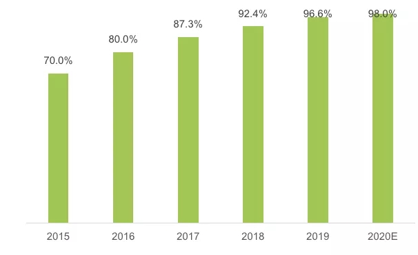 圖2 2015—2020年快遞網點鄉鎮覆蓋率變化情況