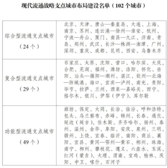 《通知》堅持系統(tǒng)思維和全局觀念,突出國家所需和城市所長,按照服務重要商品和資源要素流通、強化跨域跨界輻射帶動、促進現(xiàn)代流通發(fā)展等三個維度布局流通支點城市。綜合考慮城市資源稟賦、發(fā)展基礎、比較優(yōu)勢、未來潛力,將102個城市納入布局建設范圍,覆蓋全國31個省區(qū)市以及新疆生產建設兵團。流通支點城市將按綜合型、復合型、功能型分類推進建設,城市人民政府發(fā)揮主體作用部署推進,努力提升自身發(fā)展水平,增強輻射帶動作用。
