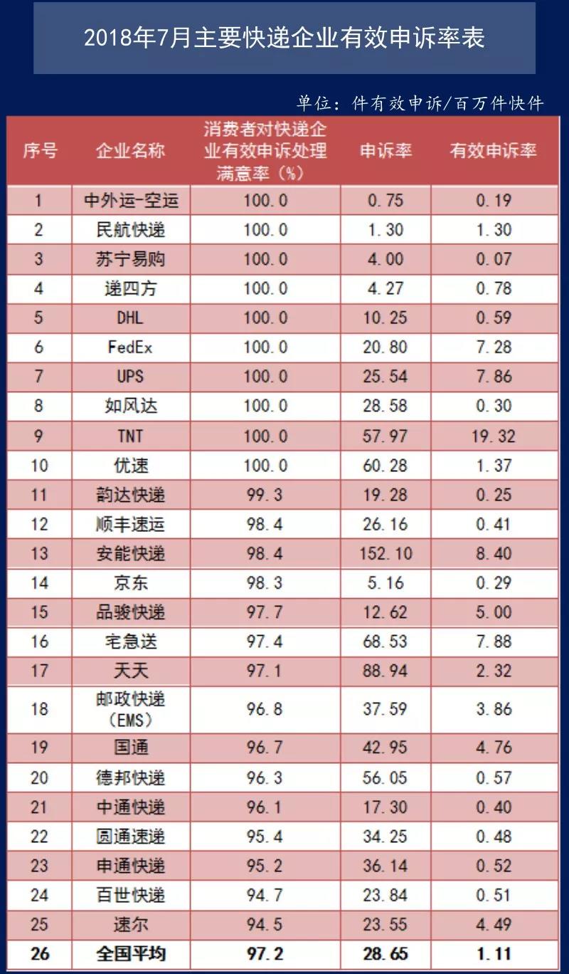 7月,消費者對快遞企業有效申訴處理滿意率(消費者對快遞企業有效申訴處理滿意件數與快遞企業有效申訴總量之比)為97.2%,低于全國平均有效申訴處理滿意率的快遞企業有9家。