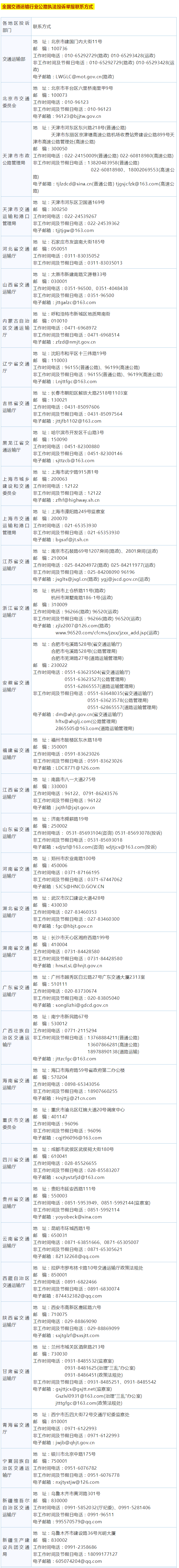 交通運輸部公路局、道路運輸司聯合向社會集中公布全國交通運輸行業公路執法行風投訴舉報電話、通信地址和電子郵箱地址。